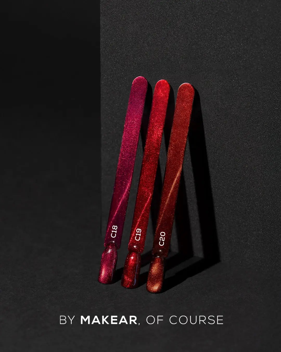 The Makear UV Gel Polish C18 Red Cat Eye is the go to shade for lovers of that mysterious and elegant touch. This deep red tone with a subtle cat eye shimmer creates a fascinating play of light that shifts with every movement. Thanks to magnetic particles, you can easily create a dimensional effect that is both wearable and eye catching.