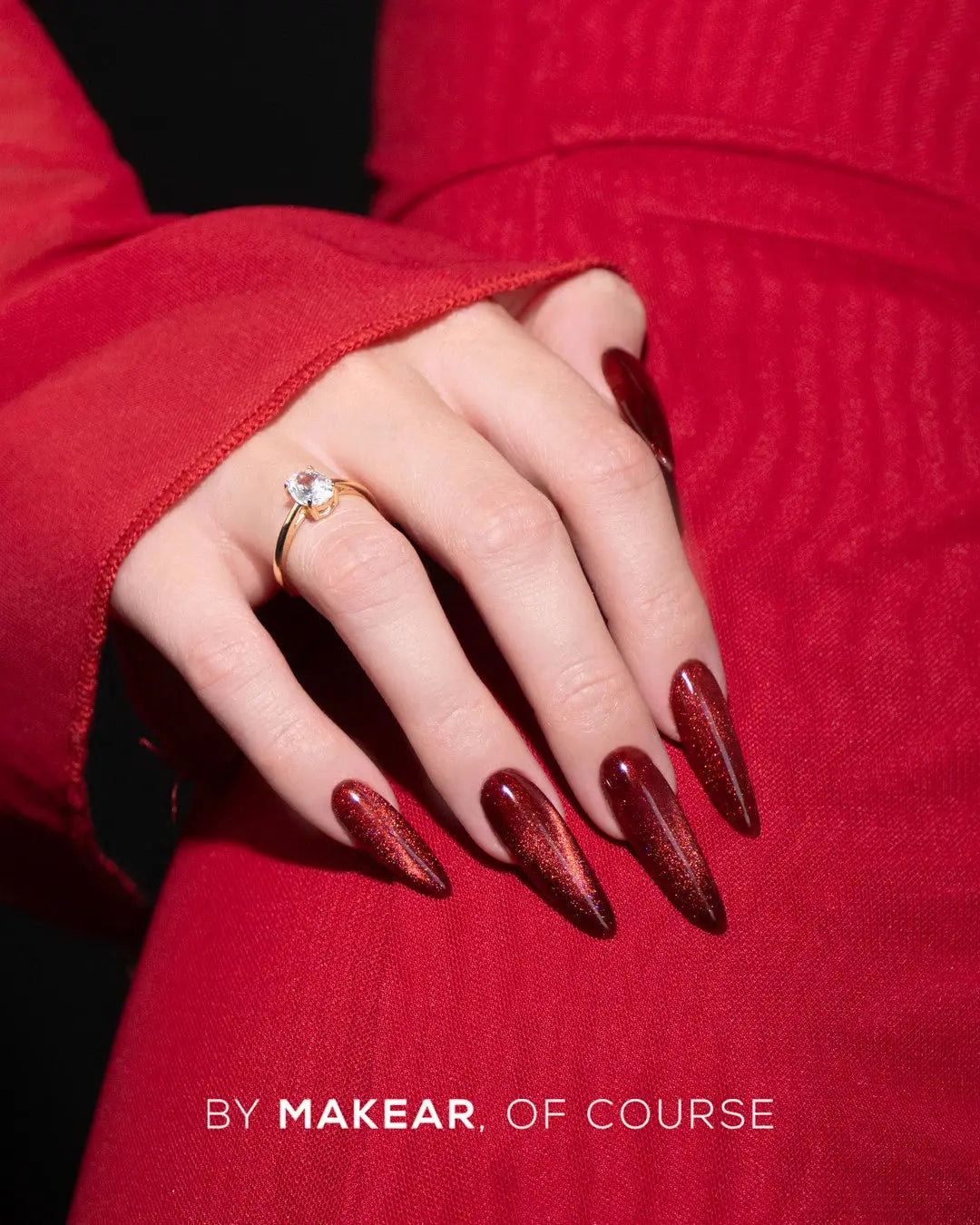 The Makear UV Gel Polish C20 is the perfect shade for anyone who loves that mysterious and elegant touch. This deep red tone with a subtle cat eye shimmer creates a fascinating play of light that shifts with every move. The magnetic particles make it easy to achieve a dimensional effect that is both wearable and eye catching.