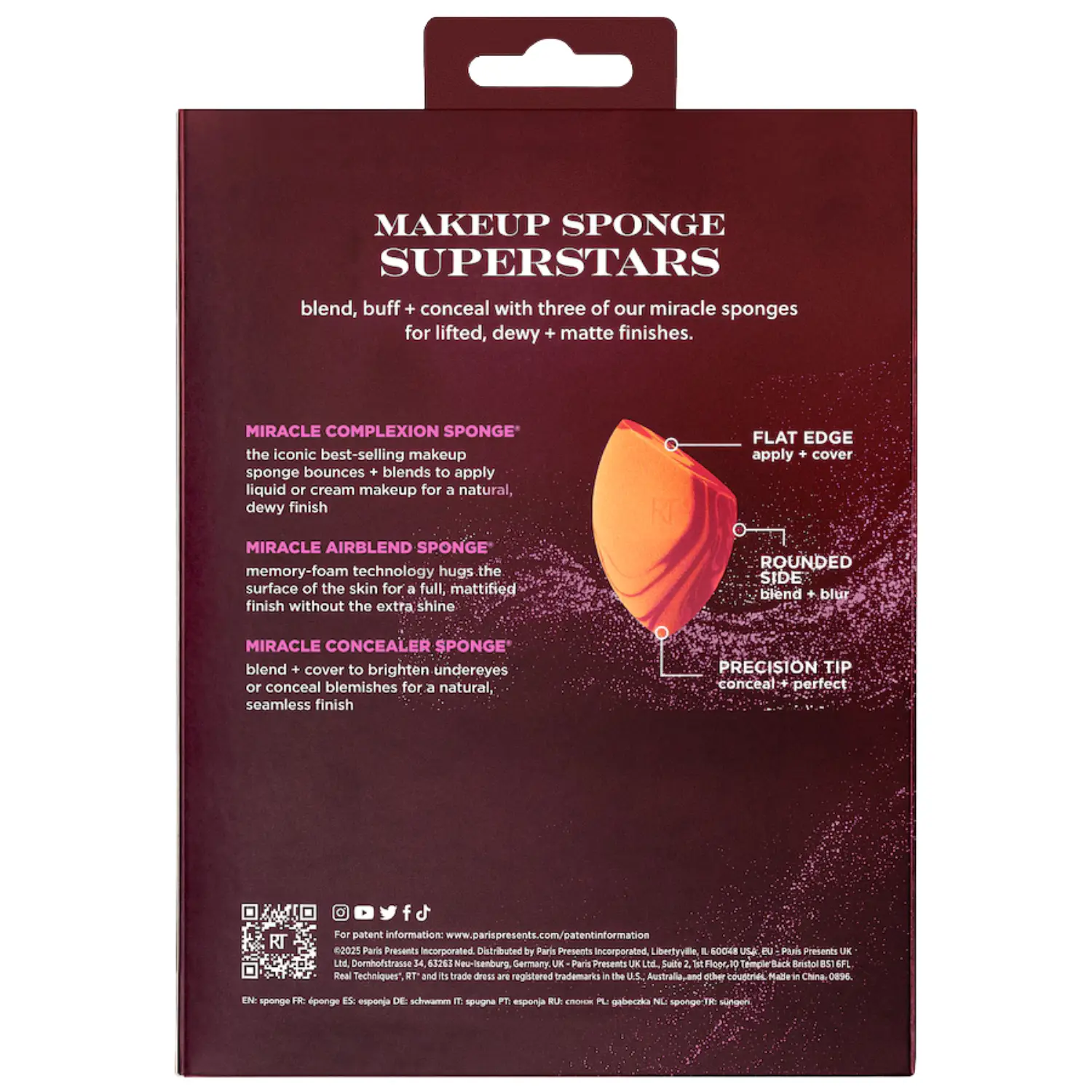The Real Techniques Makeup Sponge Superstars are the ultimate trio for a flawless finish, whether you love a dewy glow or a matte look. This set includes three Miracle sponges that make it easy to blend, buff, and conceal. Perfect for your everyday makeup or when you're going all out!