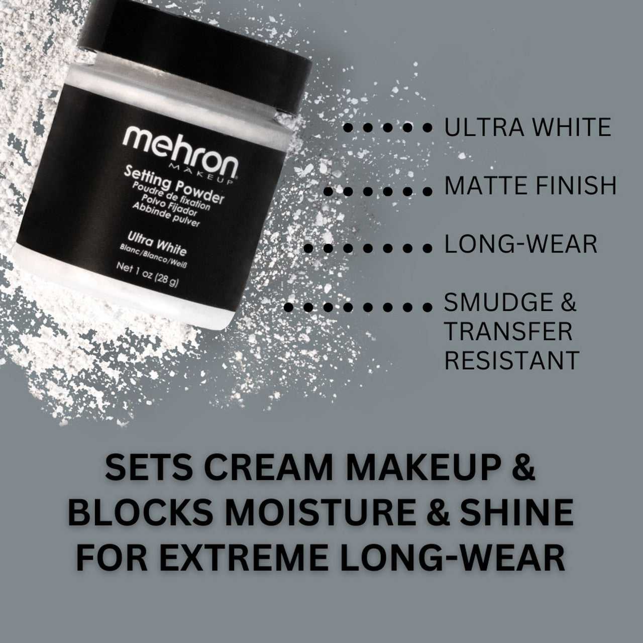 The Mehron Makeup Setting Powder Ultra White is your go-to powder to perfectly set cream makeup like the Mehron CreamBlend Sticks. This ultra-fine powder prevents shine, makes your makeup transfer-proof and keeps everything in place all day. Thanks to the ultra-light texture, it feels silky soft on the skin and blends effortlessly without looking heavy.