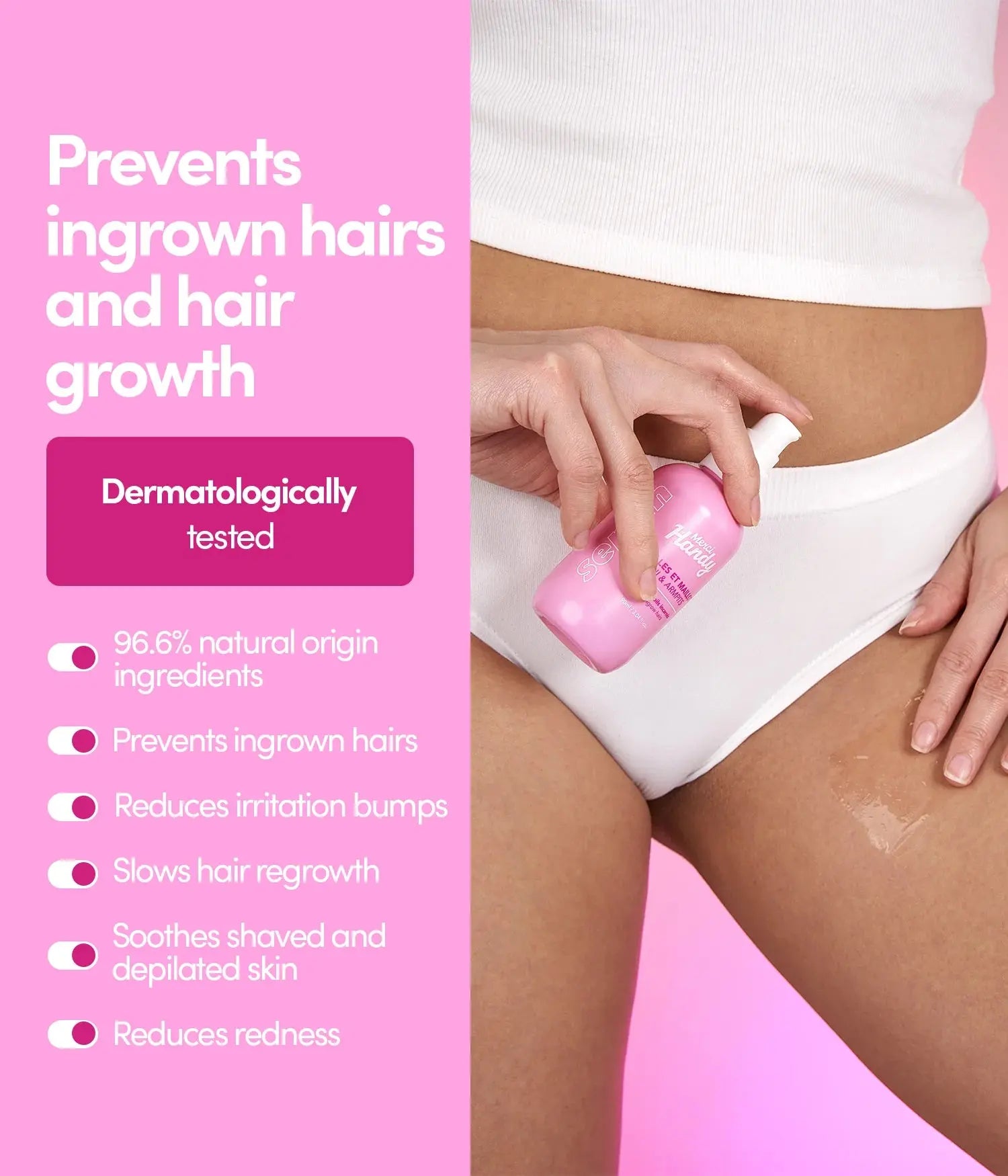 The Merci Handy Body Serum Underarms & Bikini Line is your new holy grail for smooth, well-cared-for skin: without irritation, bumps, or ingrown hairs. This gentle yet powerful formula is specially developed for sensitive areas like your underarms and bikini line: the places that definitely deserve some extra love after shaving or waxing.