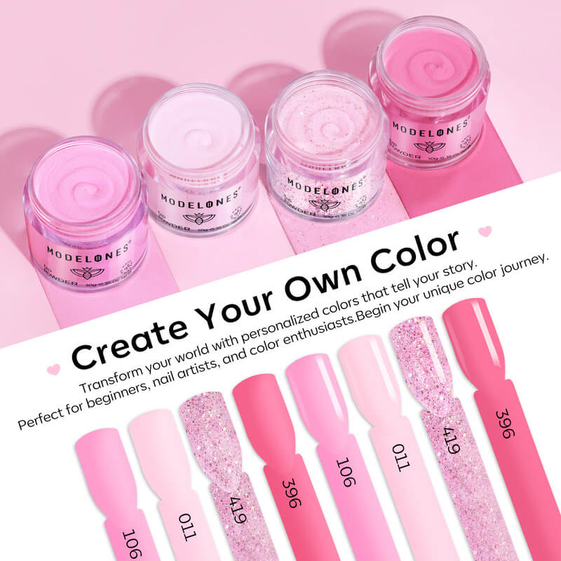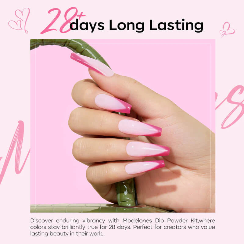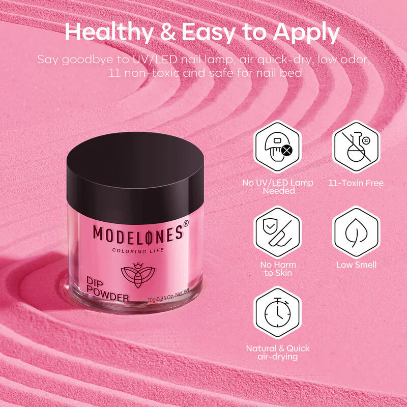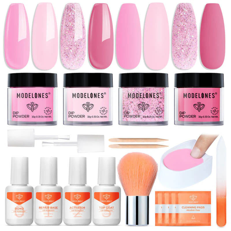 The All-In-One Dip Powder Kit Pick Me by Modelones is your new favorite for perfect pink nails with a playful twist! This complete set includes 4 beautiful dip powders in a range of pink shades: from soft and romantic to a sparkling glitter that gives your nails that extra touch. Whether you wear them solo or combine for a dreamy nail art look: this kit always has you covered.