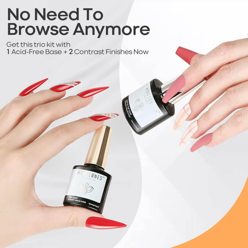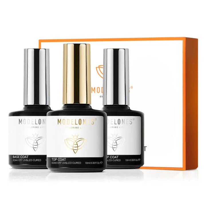 The Modelones Matte & Shine Top Coat with Base Gel Set works with a UV/LED lamp and is the ultimate bundle for a long-lasting, flawless manicure! This 3-piece set prevents nail discoloration and keeps your mani looking perfect for up to 21 days. Whether you love a glossy mirror finish or prefer that trendy matte look: this set has the perfect top coat for every style.