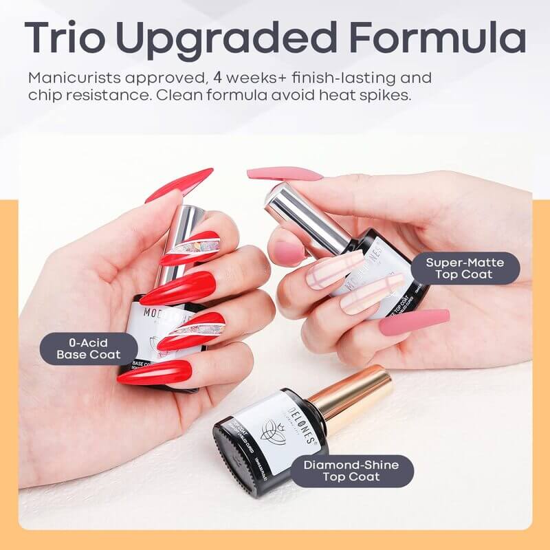 The updated formula offers excellent adhesion, so you don’t have to worry about chipping, smudging or lifting. The base coat creates a strong foundation, while the glossy top coat delivers an intense shine. Prefer a softer touch? The matte top coat gives a velvety finish. Best part? This set works with all gel polish brands: though you’ll get the best results using it with Modelones gel colours.
