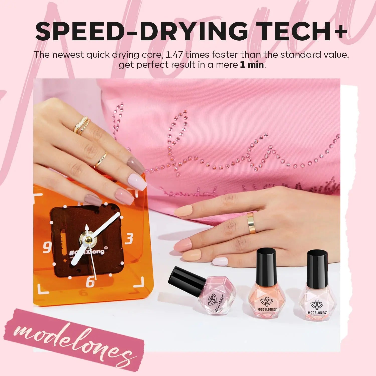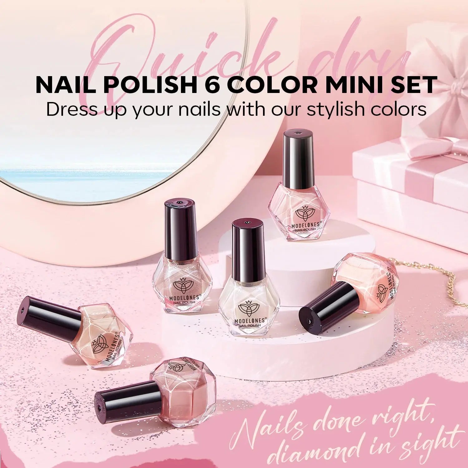 The Modelones Nail Polish Champagne Problem is the go-to polish to get your nails instantly on fleek: no lamps or long drying times needed! This set includes soft pink shades, two of which are enriched with a beautiful glitter finish. Wear them solo for an elegant vibe or mix and match for a playful, creative look. Either way, your mani will always be a party.