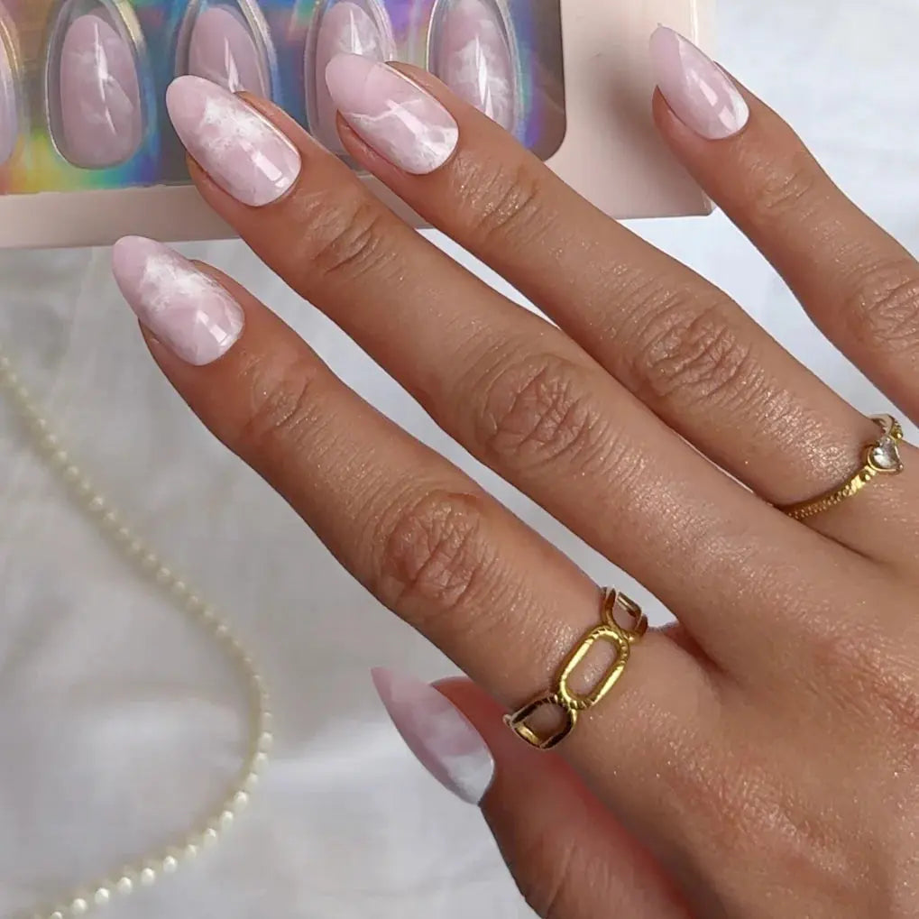 The Nailday Soft Gel Press-On Nails Candy Clouds will have you daydreaming with every move of your hands. These medium almond press-ons feature a dreamy pink marble effect reminiscent of cotton candy clouds at a summer sunset, soft, playful, and effortlessly stylish. Perfect for a minimal yet magical summer vibe.