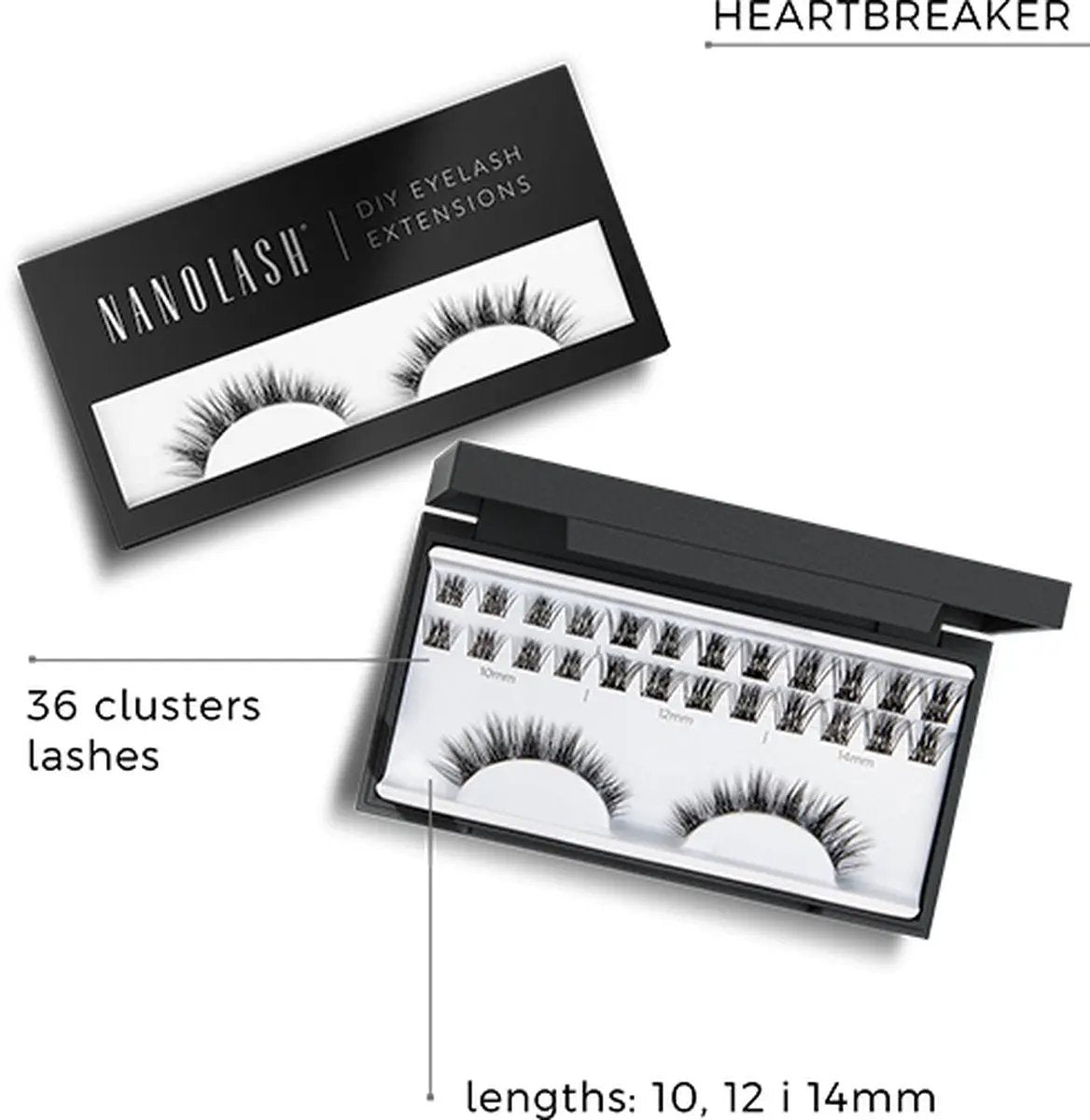 The Nanolash DIY Eyelash Extensions Heartbreaker are anything but basic. This showstopper gives you that shiny, wet lash effect that instantly stands out: perfect for anyone who loves a seductive, bold eye look. Thanks to the mix of 10, 12 and 14 mm clusters, these lashes create effortless volume, shine and depth: no eyeliner needed (unless you're going for extra drama, of course).
