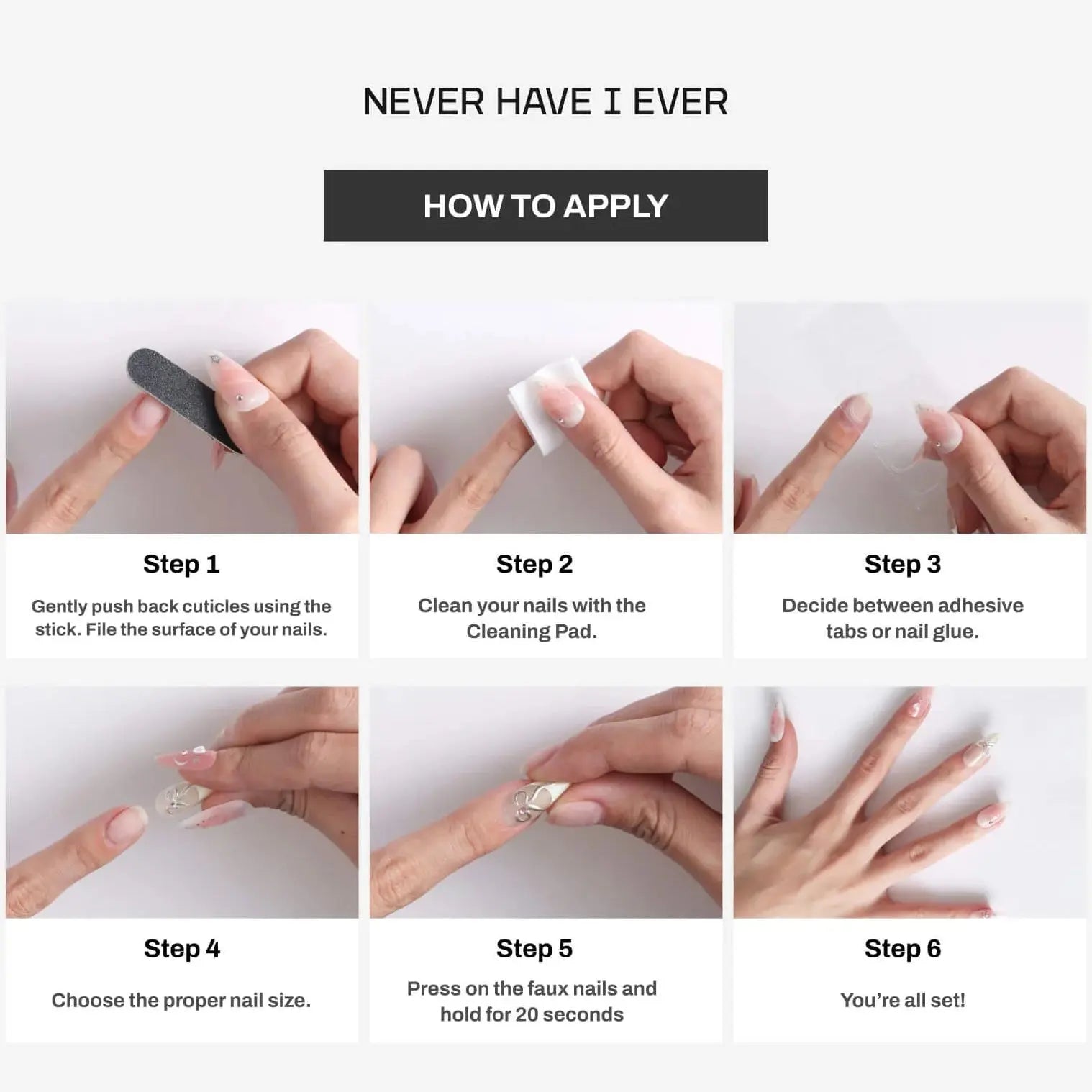 - Remove the protective film from the adhesive tabs and place the nail on your natural nail or use the included nail glue.