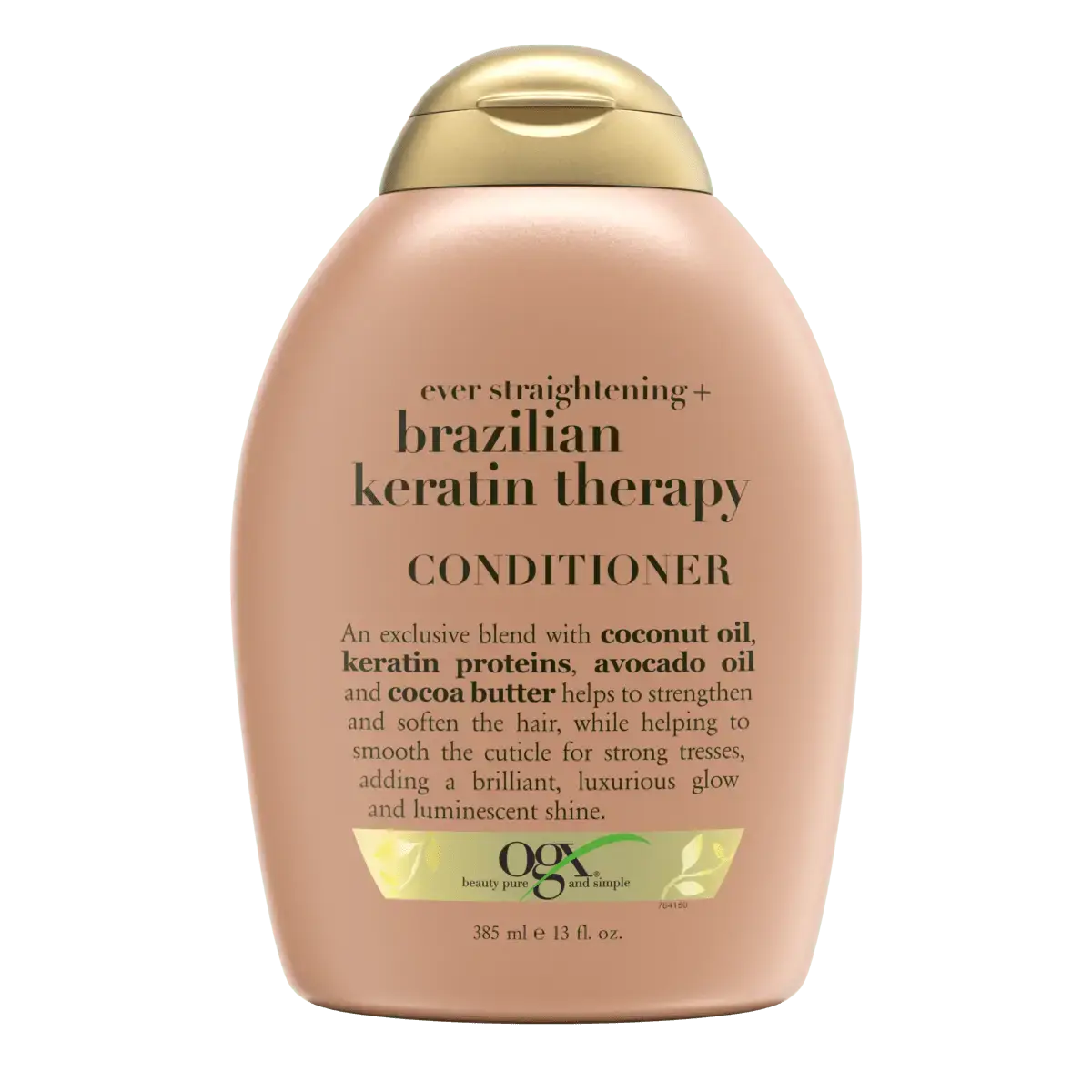 - Apply OGX Ever Straight Brazilian Keratin Smooth Conditioner to wet, washed hair, focusing on the lengths and ends.