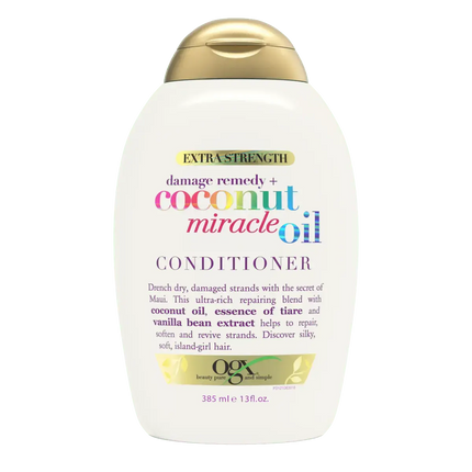 - Apply OGX Extra Strength Damage Remedy + Coconut Miracle Oil Conditioner to wet, washed hair, focusing on the lengths and ends.