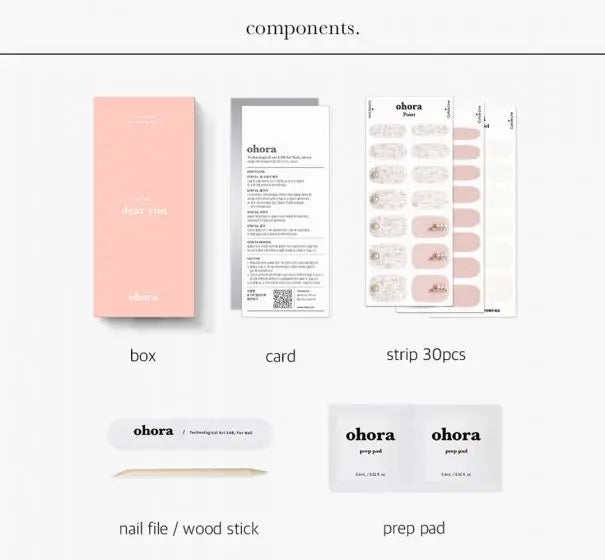 Contents: 30 nail strips in 15 different sizes, 2 preparation wipes, 1 nail file, 1 manicure stick.