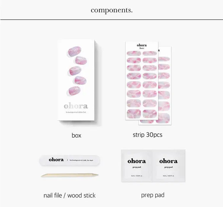 Contents: 30 nail strips in 15 different sizes, 2 preparation wipes, 1 nail file, 1 manicure stick.