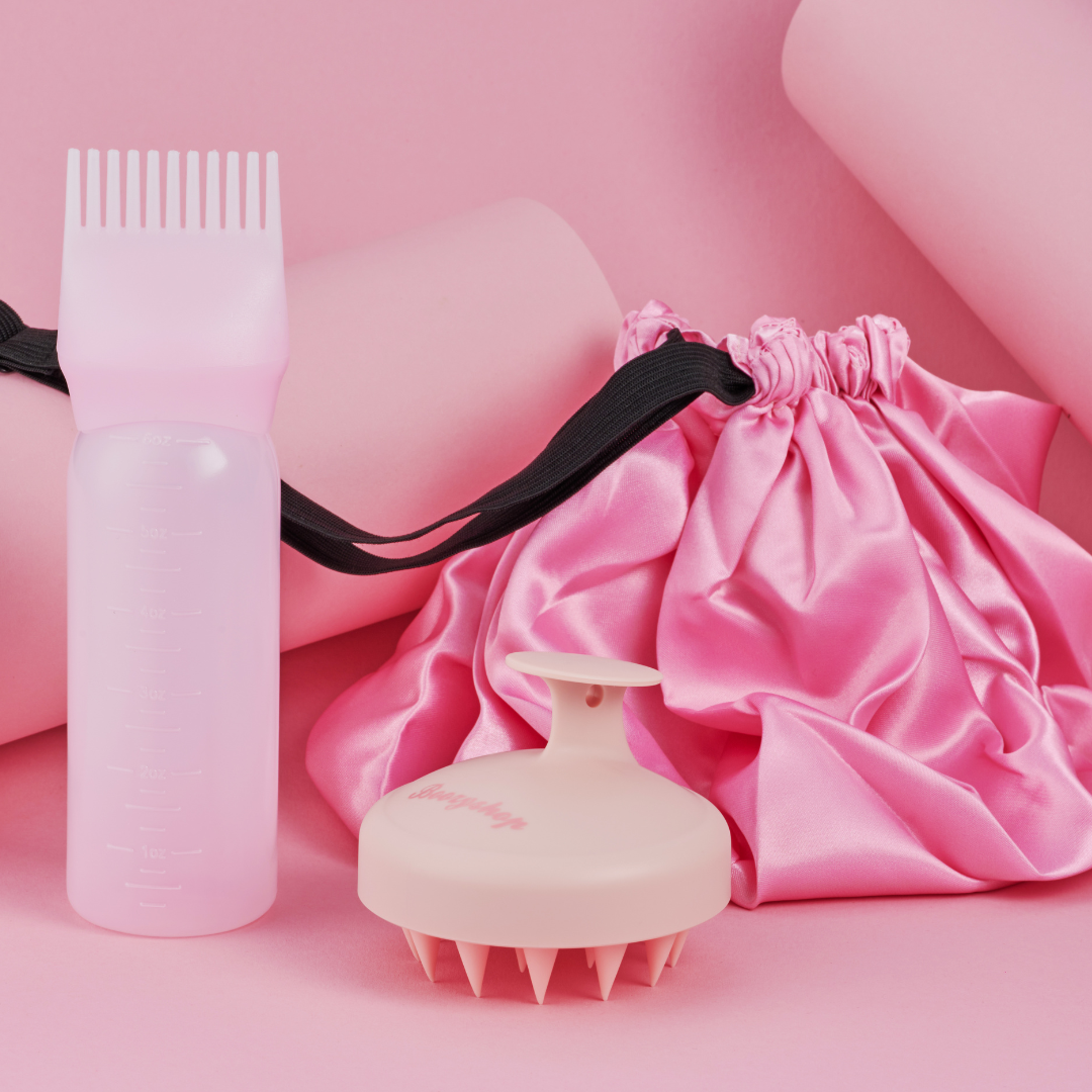 The Boozyshop Overnight Oiling Set has everything you need for a nourishing and relaxing scalp care routine while you sleep! This complete set combines our favorite tools to treat your hair, stimulate your scalp, and protect your hair overnight. Perfect for deep oil treatments without the mess – and wake up frizz-free!