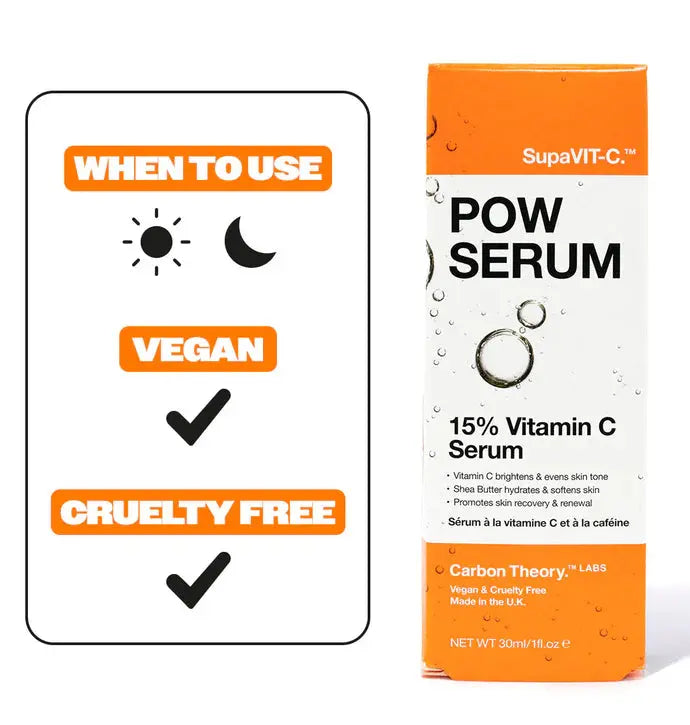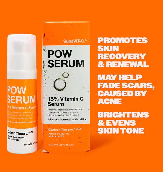 The Carbon Theory Pow Serum 15% Vitamin C is your secret weapon for a radiant, even complexion! This powerful SupaVIT-C serum is specially formulated to tackle pigmentation and scarring after breakouts and visibly refresh your skin.