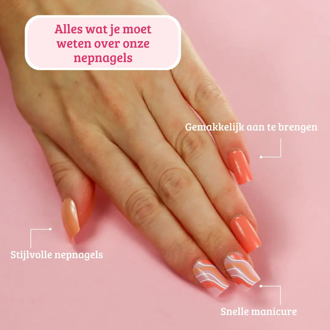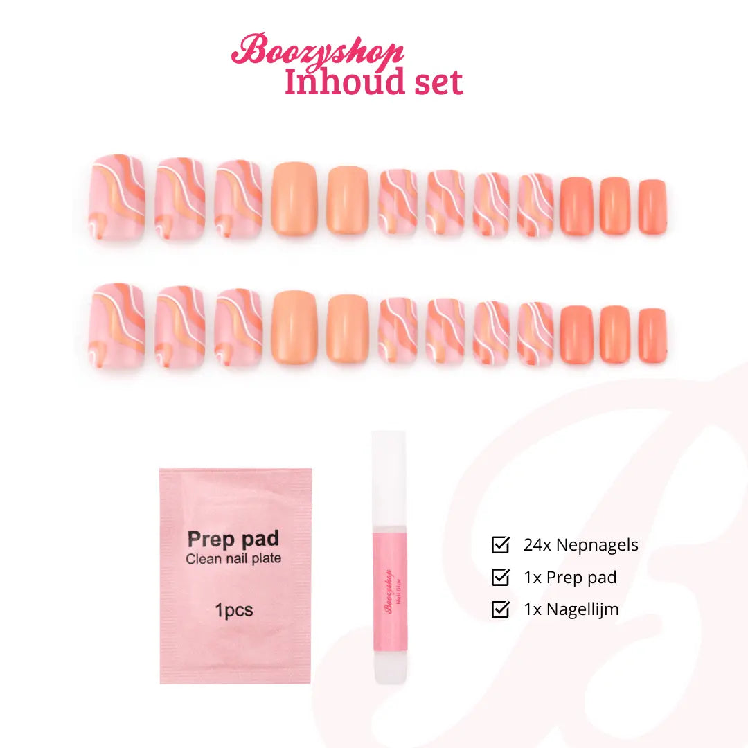 The Boozyshop Press On French Nails Orange Waves are the perfect solution for beautiful nails in an instant. These artificial nails are not only stylish, but also have a cheerful wave design that gives your nails a unique and elegant look. Treat yourself to a quick manicure with this set of press on nails, consisting of 24 pieces in 10 different sizes. Each nail is numbered from 0 to 9, which makes it easier to choose the most suitable size. This set also contains nail glue and a prep pad to optimally prepare your nails for long-term adhesion.