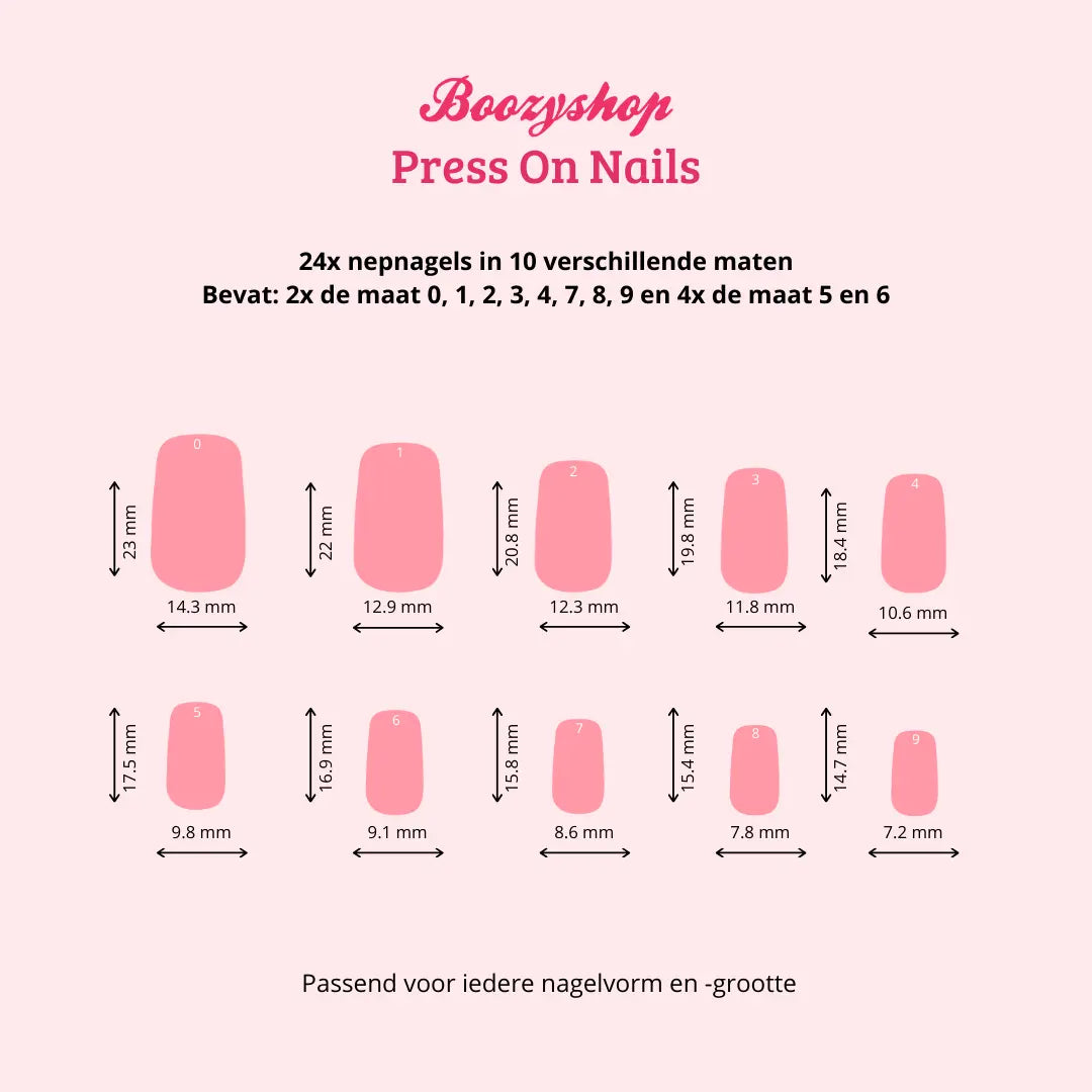 Whether you are looking for the timeless elegance of classic French Nails, or want to let your creativity shine with striking nail art, Boozyshop has an extensive range of stick-on nails in different designs and colors. There is always a style that suits you! Turn your nails into a true work of art with our high-quality artificial nails.