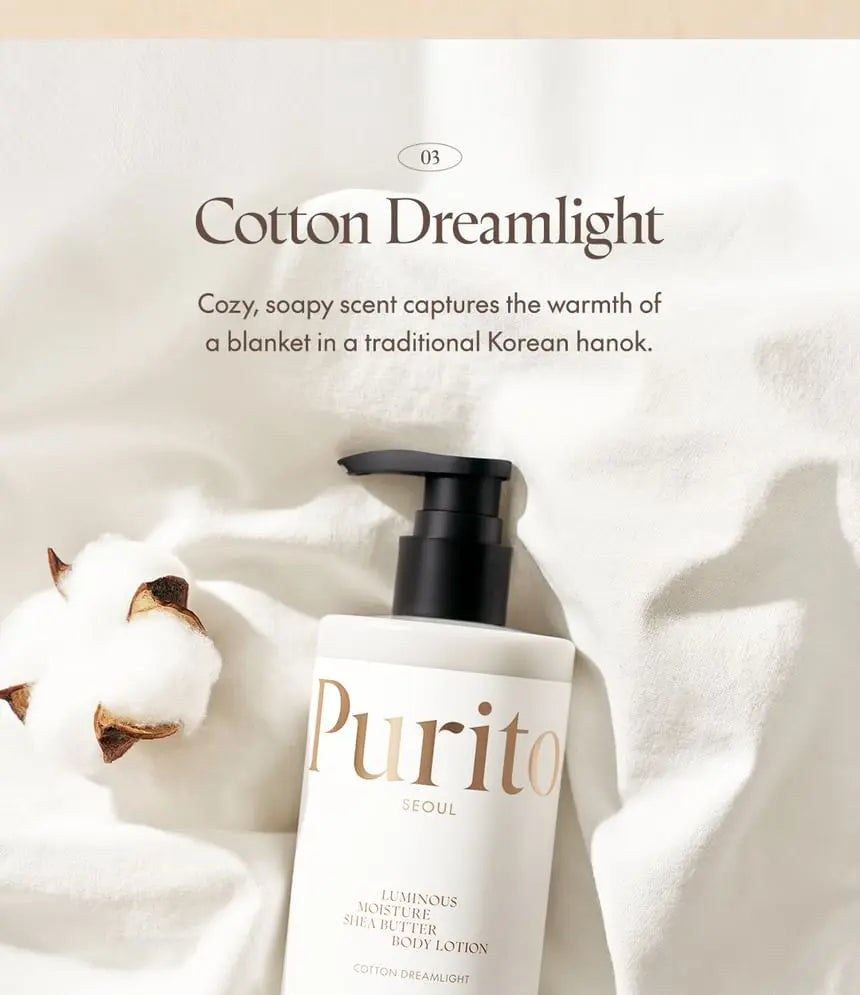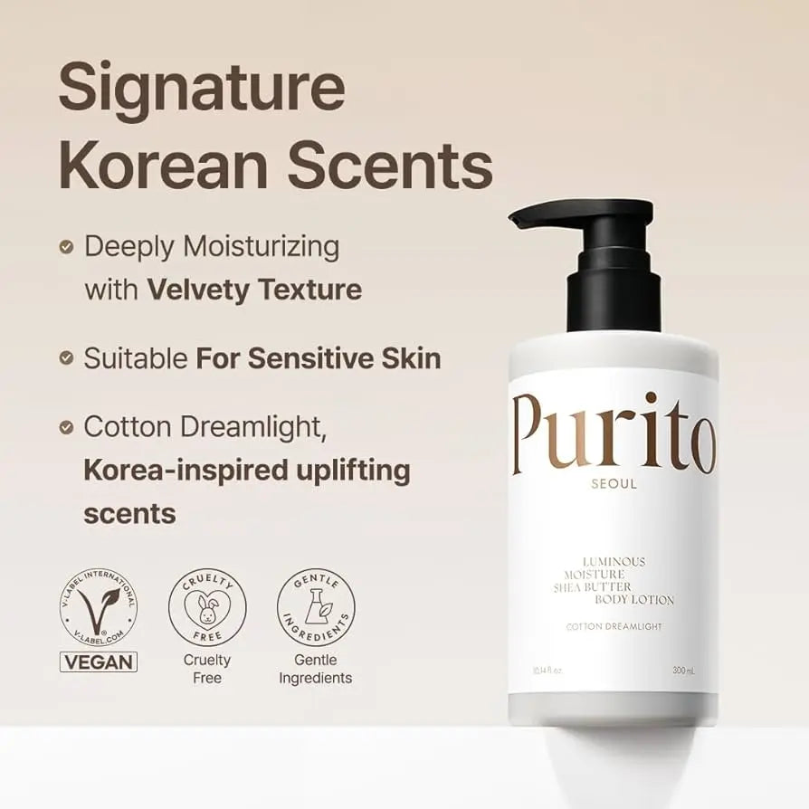 The Purito Luminous Moisture Shea Butter Body Lotion Cotton Dreamlight is pure indulgence for your skin and senses! This silky-soft body lotion is enriched with deeply nourishing shea butter, Jeju starflower extract, and camellia seed oil, a powerful blend that hydrates your skin and leaves it feeling soft and smooth.