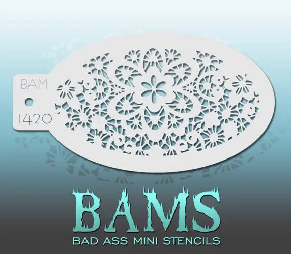 The PXP Professional Colours Face Paint Stencil BadAss 1420 is right on trend with the lace look and perfect for adding an edgy touch to your face and body paint creations. This stencil is made from high quality flexible plastic, allowing you to create clean and detailed patterns with ease, even on more difficult areas of the face or body.