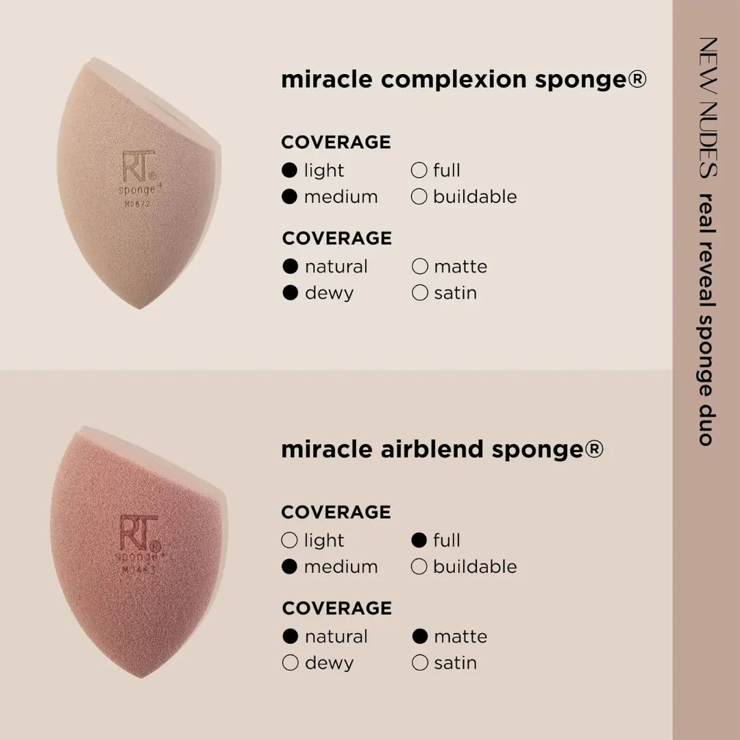 The Real Techniques Miracle Powder Sponge 2 Pack contains two best-selling Sponges for a super nice price! This set includes the Miracle Complexion Sponge for a natural, dewy glow and the mattifying Miracle Airblend Sponge for a sleek matte finish. Both sponges work perfectly with liquid and cream formulas. Use the MCS damp and the MAS dry for optimal results.