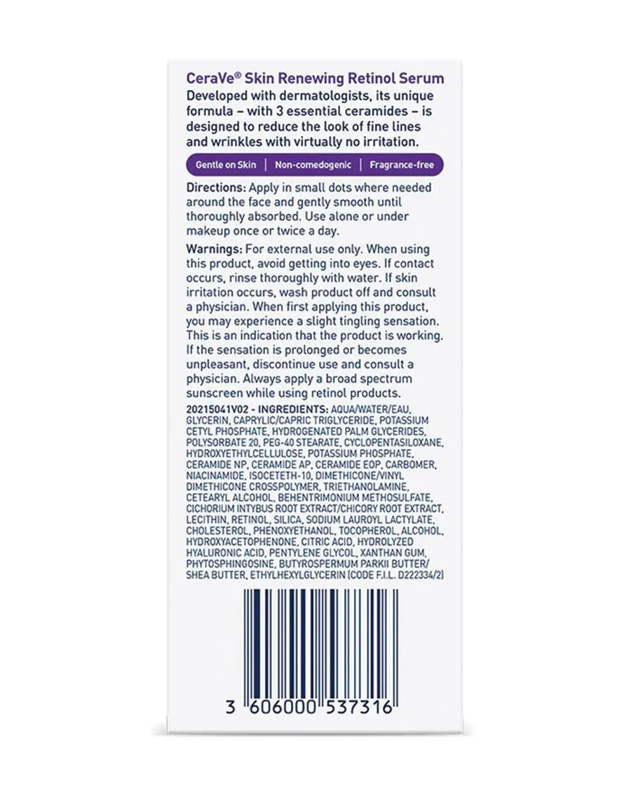 The CeraVe Skin Renewing Retinol Serum is your go-to serum for smoother, more even, and refreshed skin. This formula combines retinol with hydrating and soothing ingredients, so you can enjoy the benefits of retinol without drying out your skin. Thanks to hyaluronic acid, your skin receives an intense hydration boost, niacinamide soothes and calms, and the three essential ceramides strengthen your skin barrier and help retain moisture.