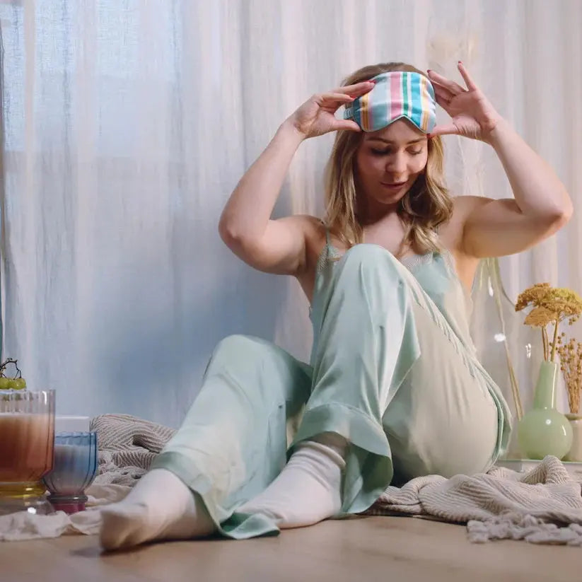 The Smug Satin Sleep Mask Bold Stripe lets you shine even in your sleep. With its bold stripe print and silky satin finish, this mask is a true eye-catcher and a must-have in your beauty routine. It not only blocks light but also cares for your skin and hair while you rest.
