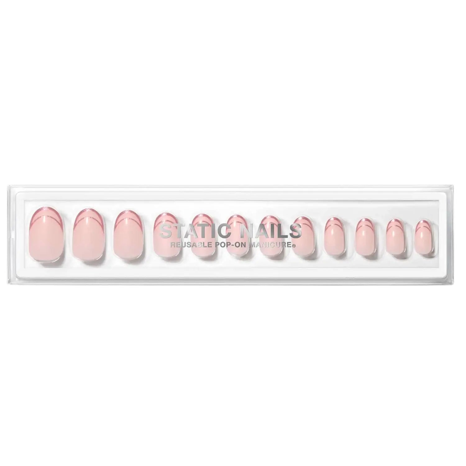 The Static Nails Reusable Pop-On Manicure Rose Gold Double French Round combines elegance with innovation for a next-level manicure you can apply right at home. These like-acrylic pop-on nails feature a classic round shape with a chic double French design and a modern rose gold twist: super stylish and wearable for any occasion.
