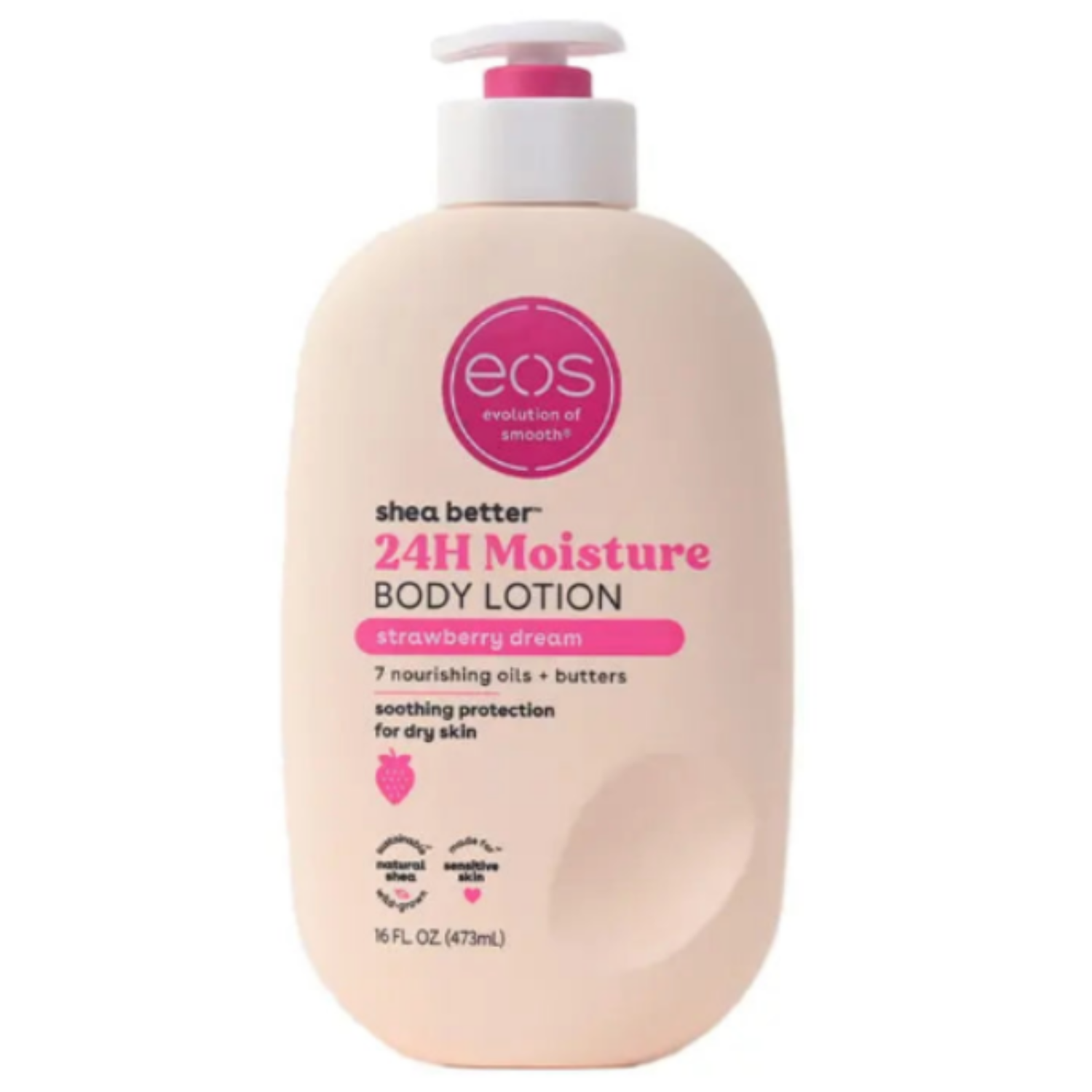 The EOS Strawberry Dream Body Lotion is a sweet dream in a bottle, light, silky, and irresistibly fragrant. This body lotion provides up to 24 hours of hydration without feeling greasy, absorbs quickly, and leaves your skin smooth, soft, and supple.