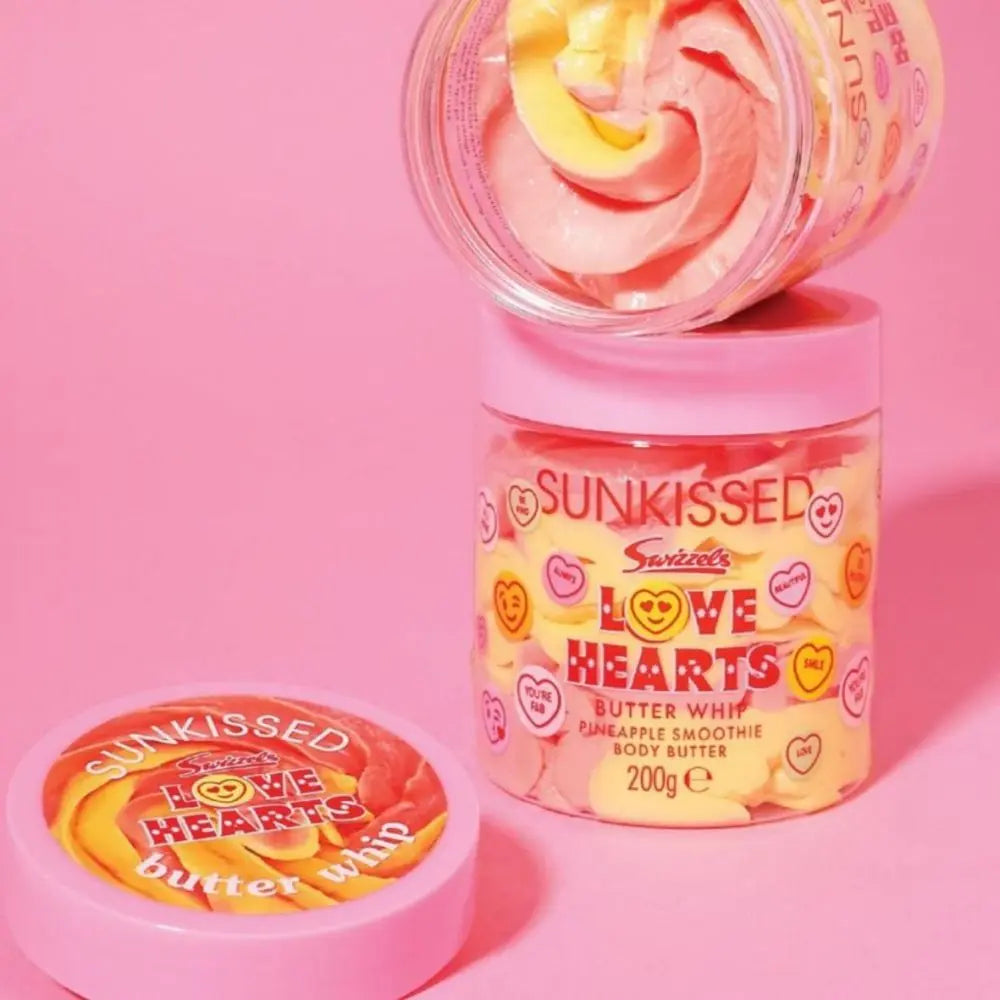 The Sunkissed Love Hearts Butter Whip Pineapple Smoothie is pure indulgence for your skin and looks like a dessert you almost want to take a bite of. This two tone whipped body butter has a luxurious, airy texture that melts instantly into the skin and delivers an intensely caring feel.
