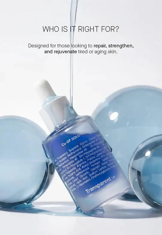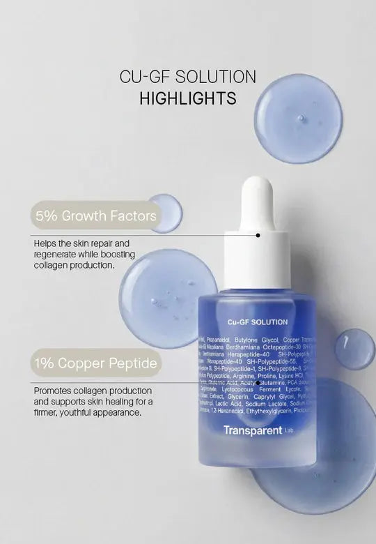 The Transparent Lab CU-GF Solution is your secret weapon against skin aging. This powerful yet lightweight serum helps visibly reduce fine lines and wrinkles while restoring that firm, healthy bounce we all love.