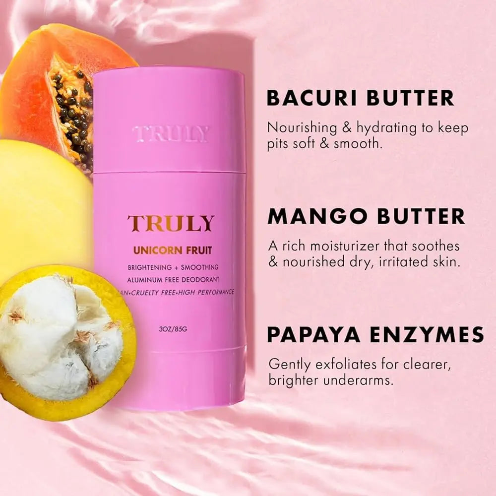 The Truly Beauty Unicorn Fruit Skin Brightening And Smoothing Deodorant is an aluminum-free deodorant that does more than just protect against odor. This fresh formula helps visibly brighten dark underarms and leaves the skin smoother and softer.